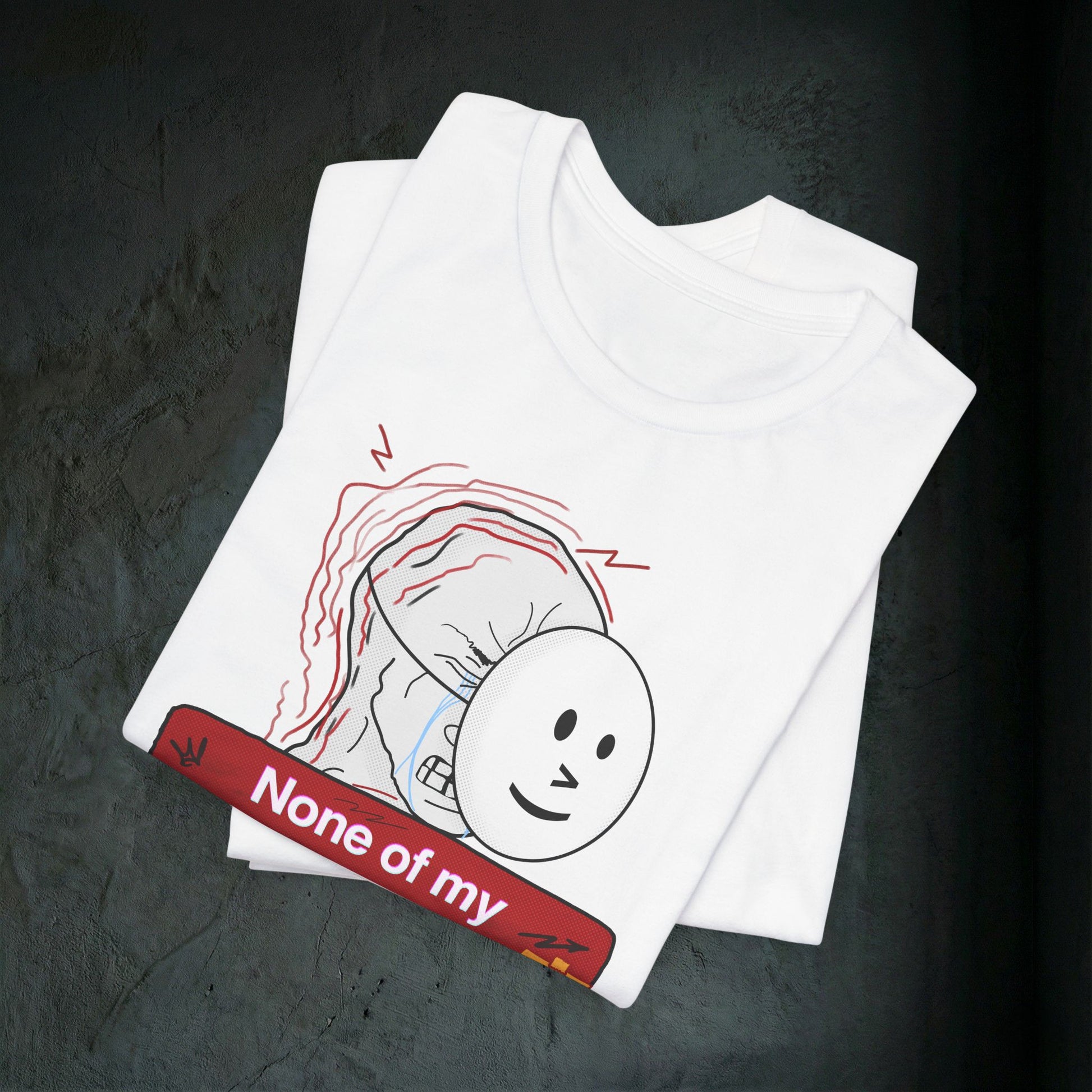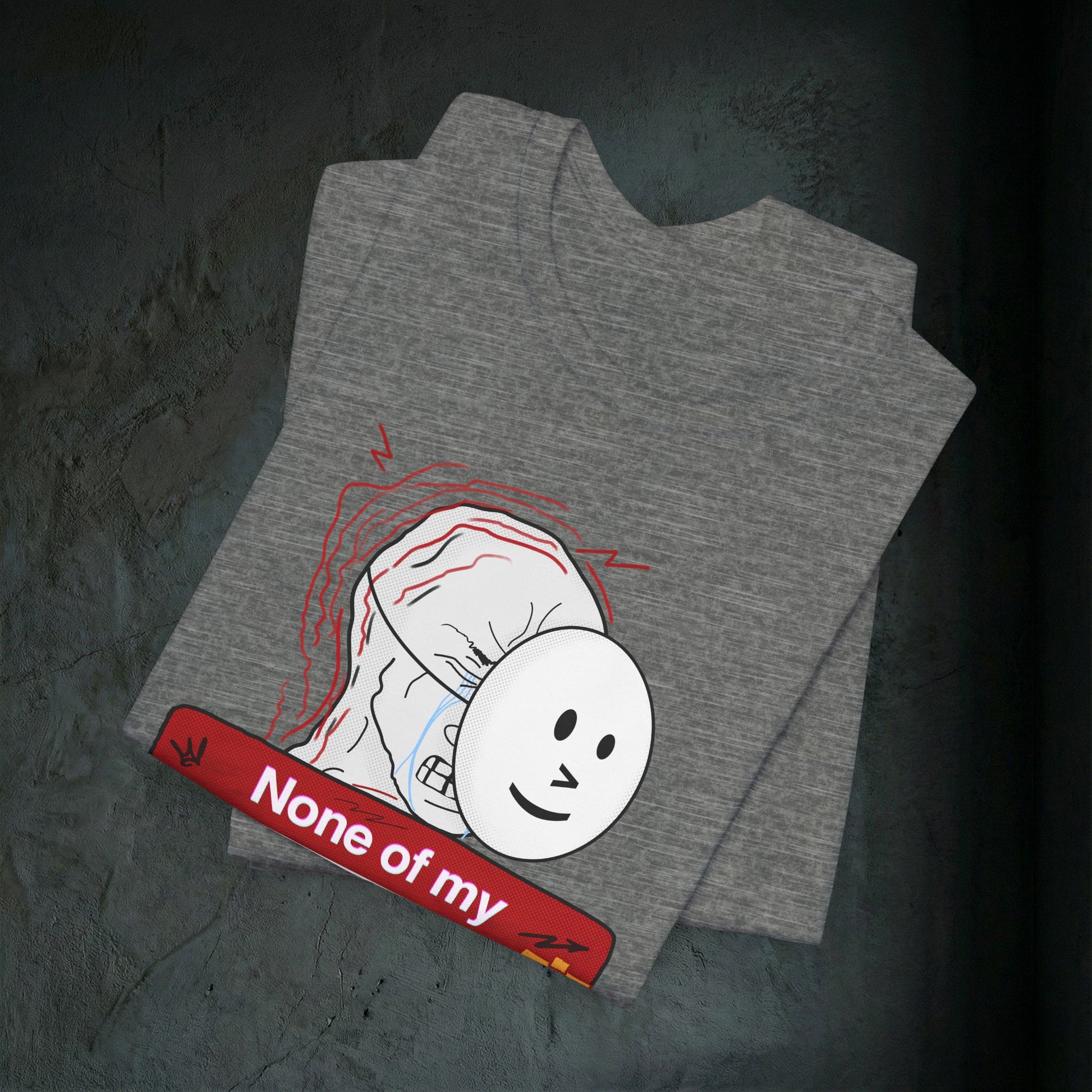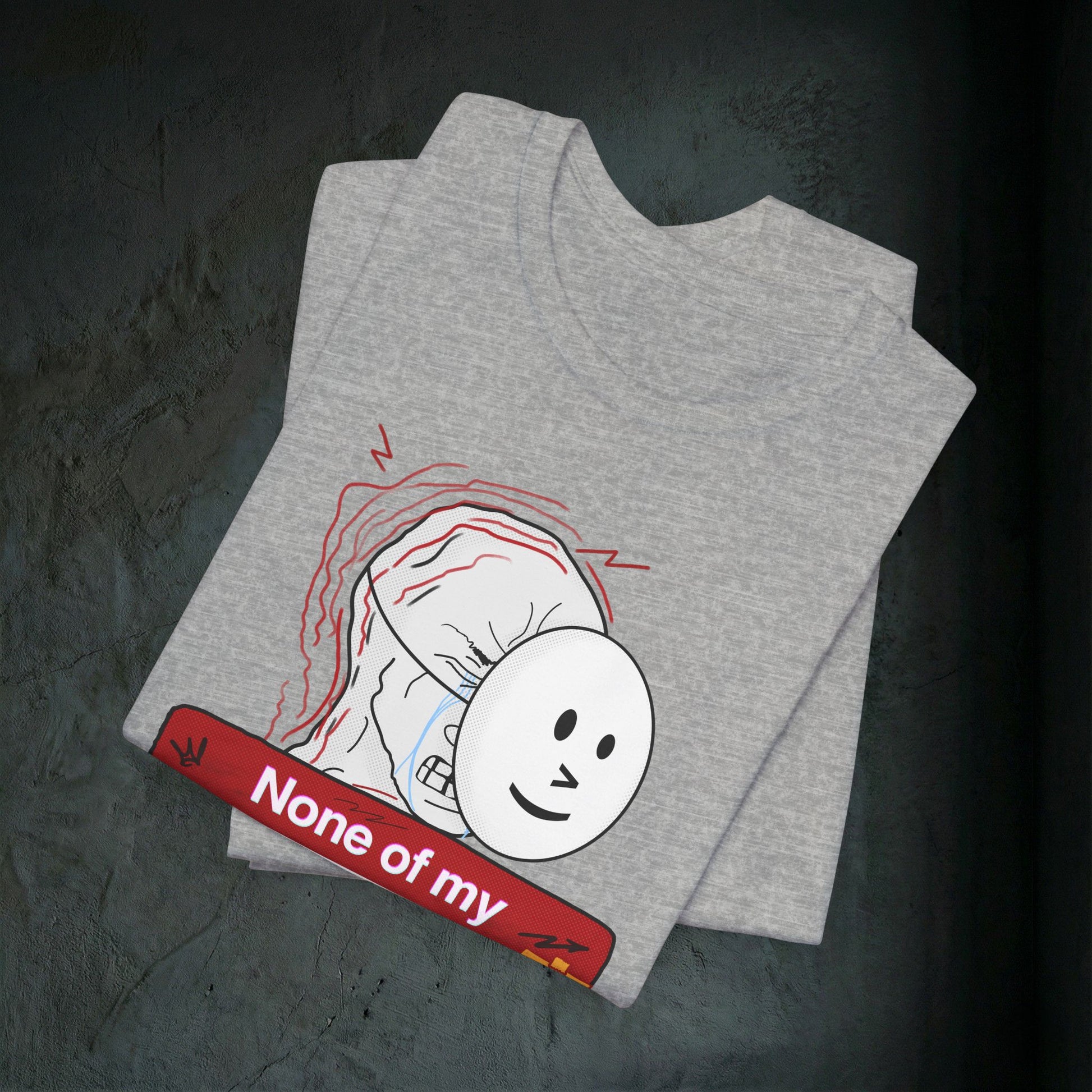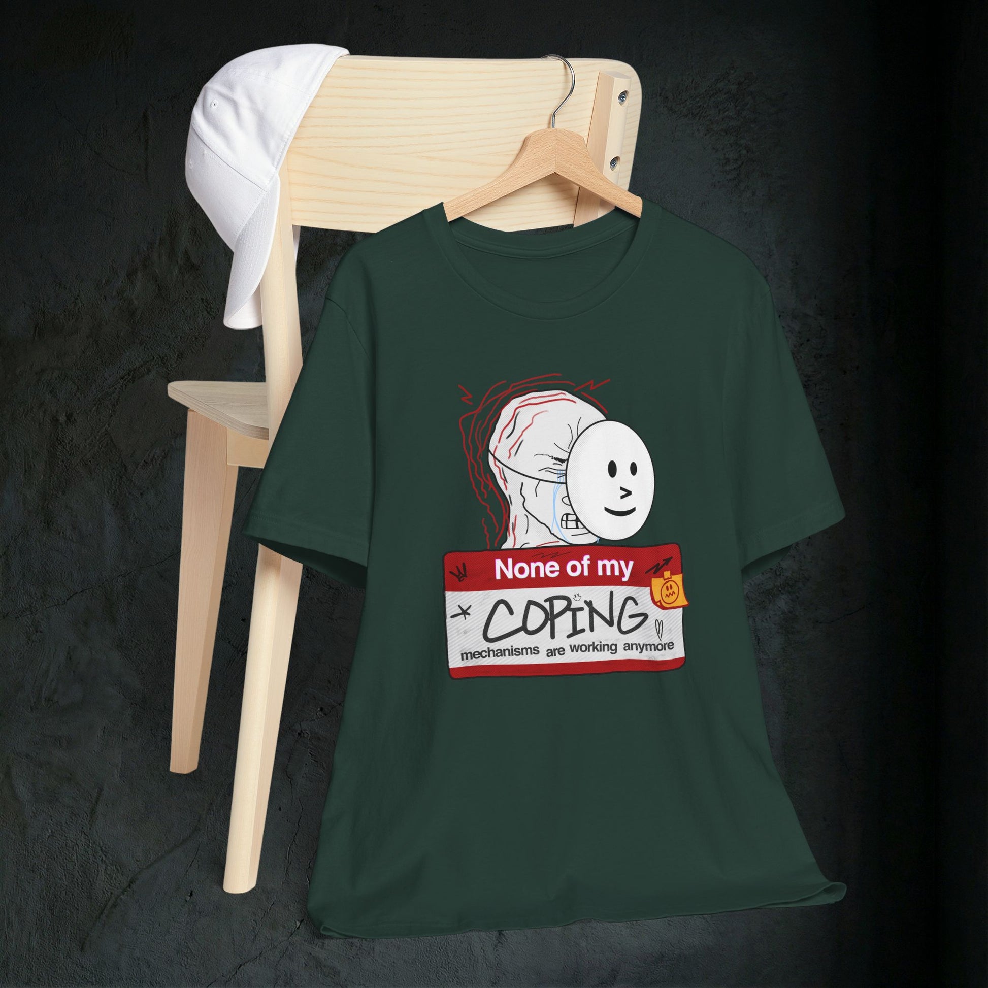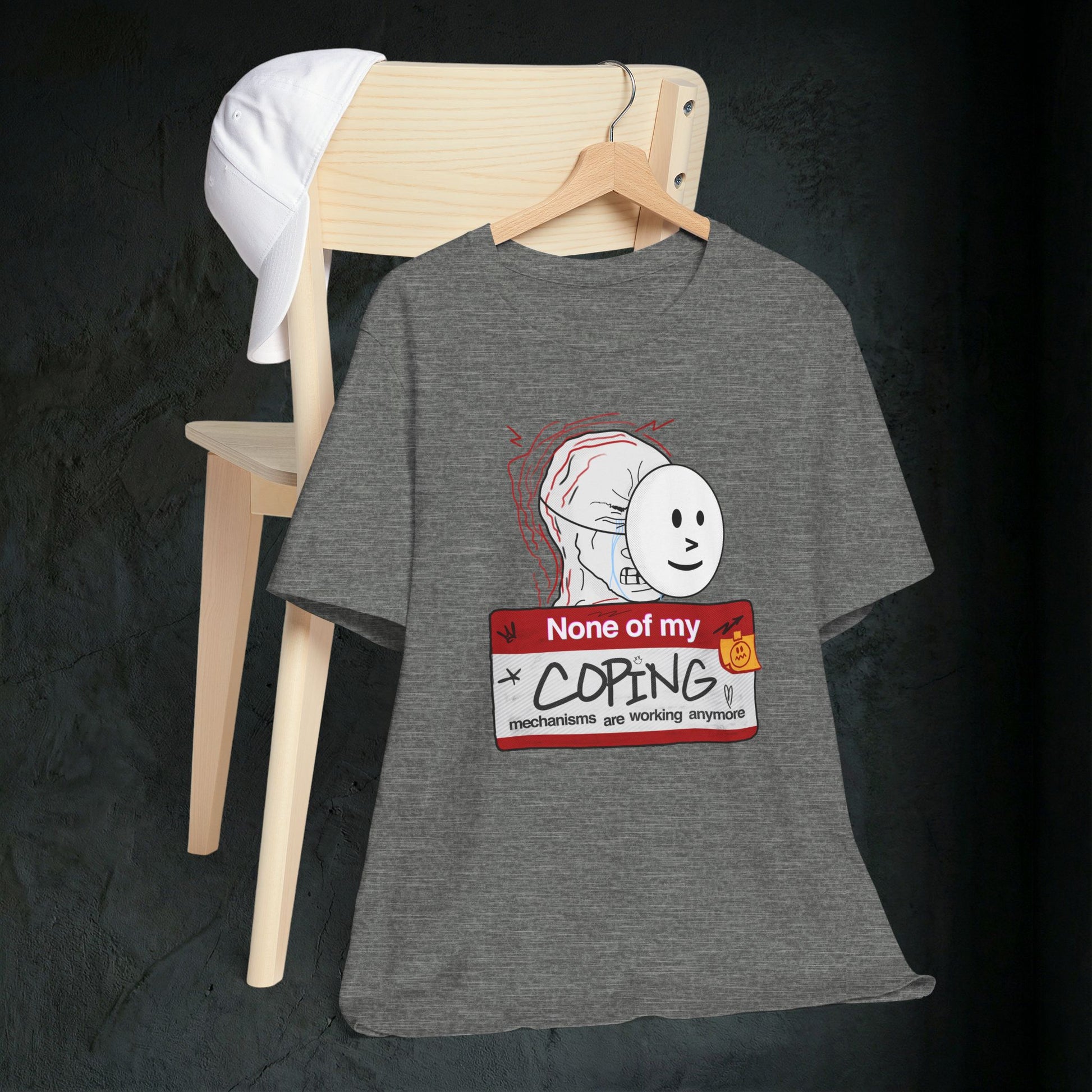We all wear masks, but sometimes the mask gets heavy. This tee captures the moment when the coffee, the scrolling, and the memes just aren't hitting like they used to. Featuring a Wojak character putting on a smiling mask with the brutal nametag "None of my COPING mechanisms are working anymore", it is a vulnerable, honest, and darkly funny statement piece.