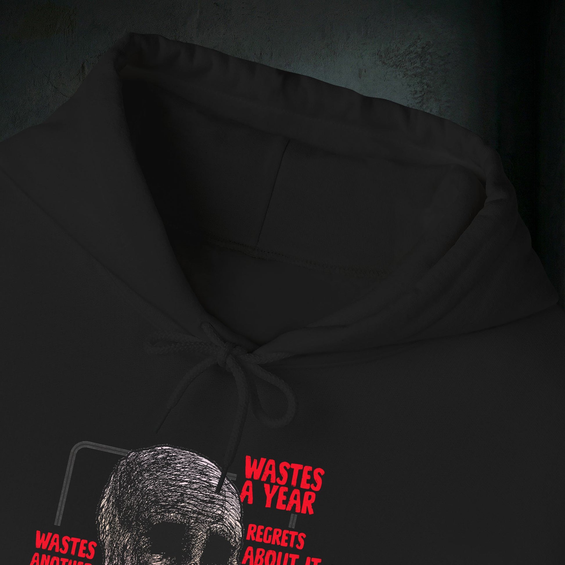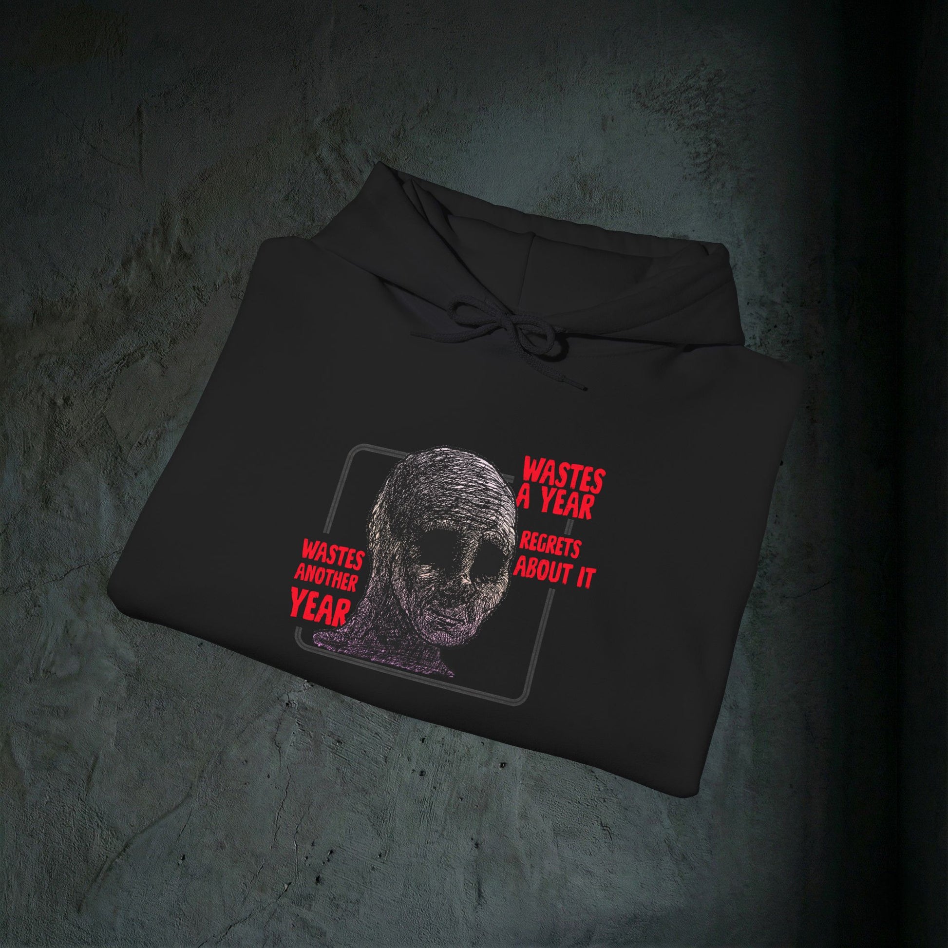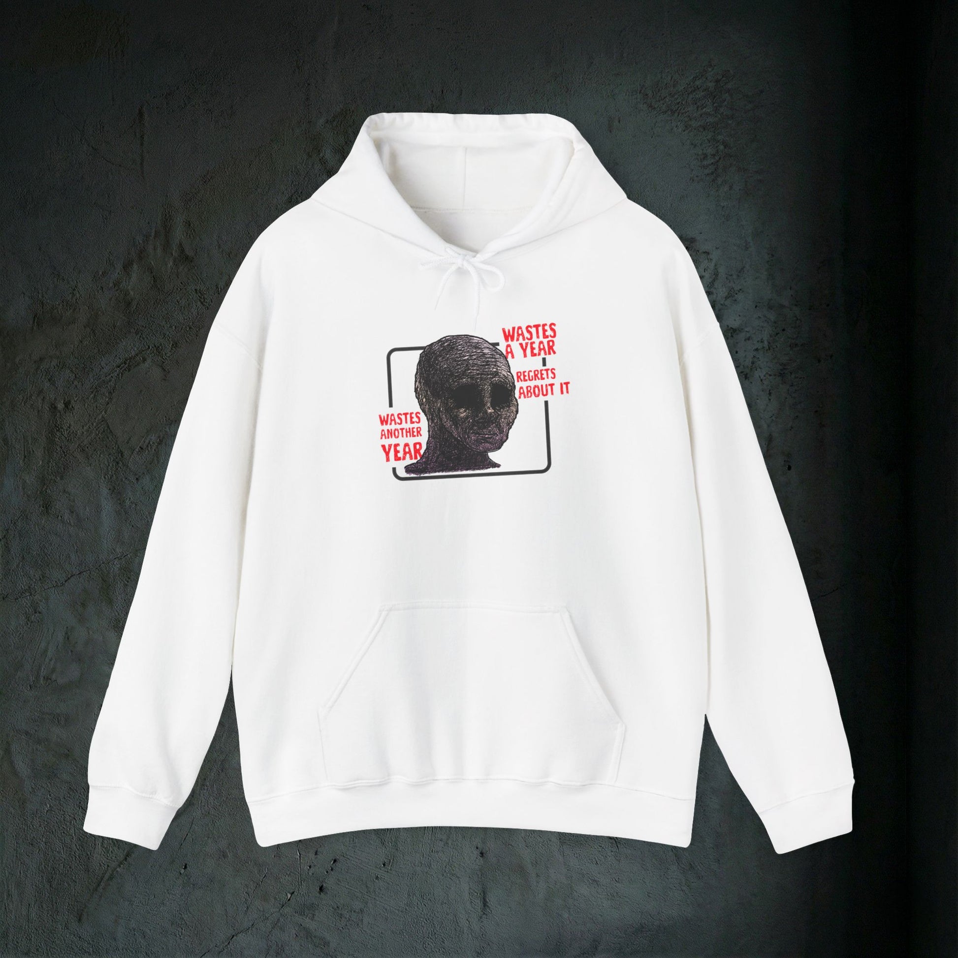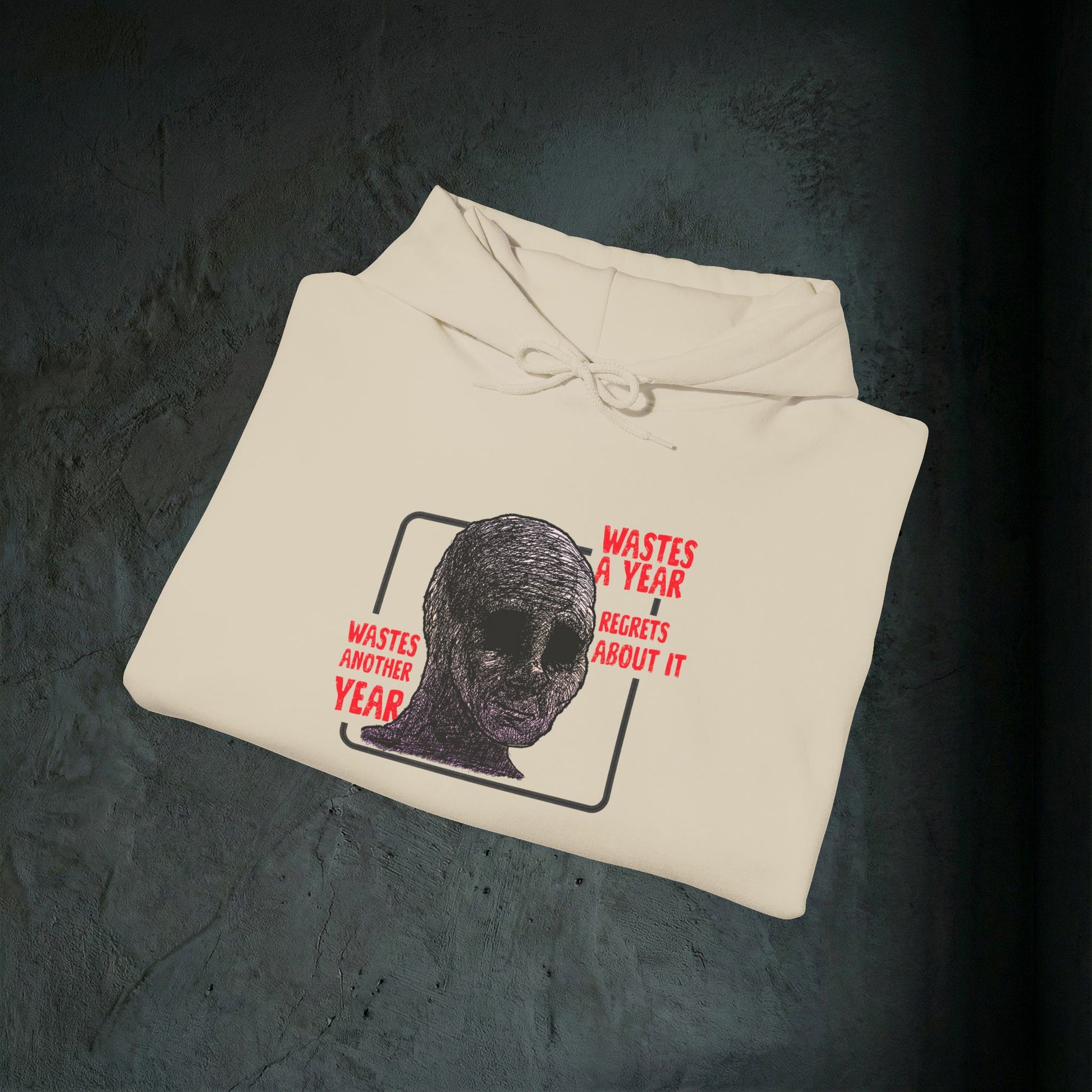 Regret might be heavy, but this hoodie is perfectly weighted. Featuring the viral "Wastes A Year... Regrets About It... Wastes Another Year" graphic, this piece captures the cycle of existential dread we all know too well. The design features the Withered Wojak in a shadowed profile with bold red text, making it a quiet but powerful statement piece for anyone who feels like time is just slipping away.