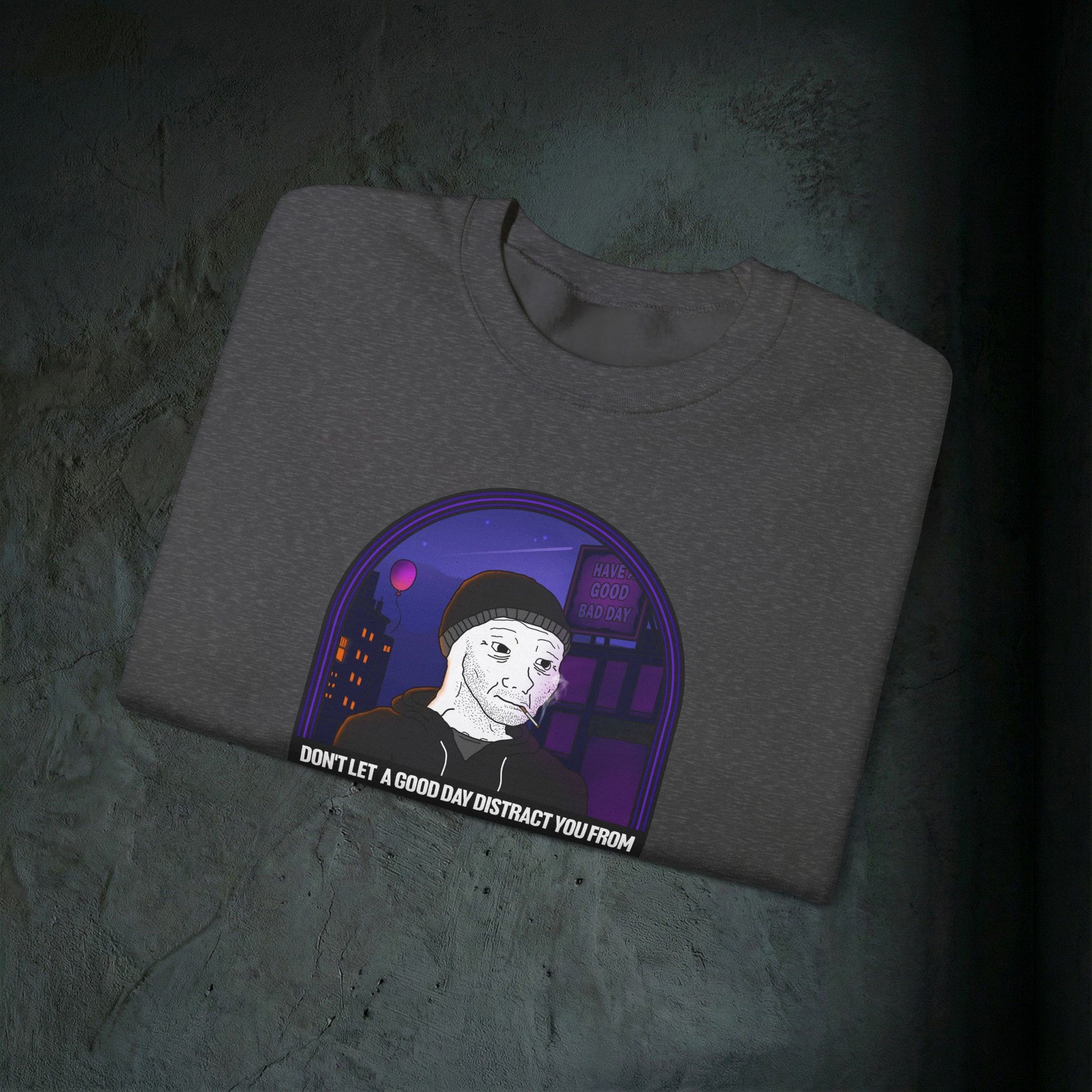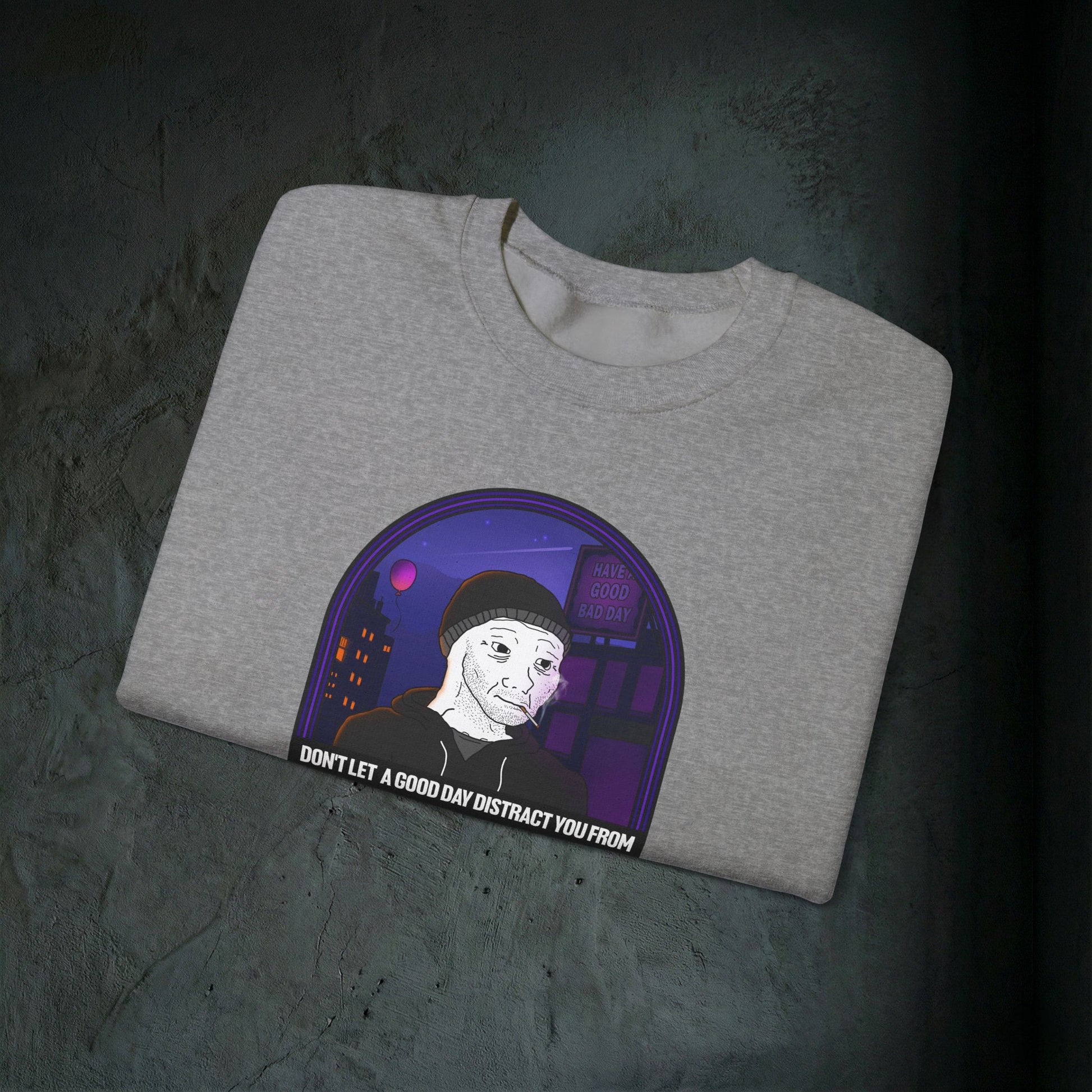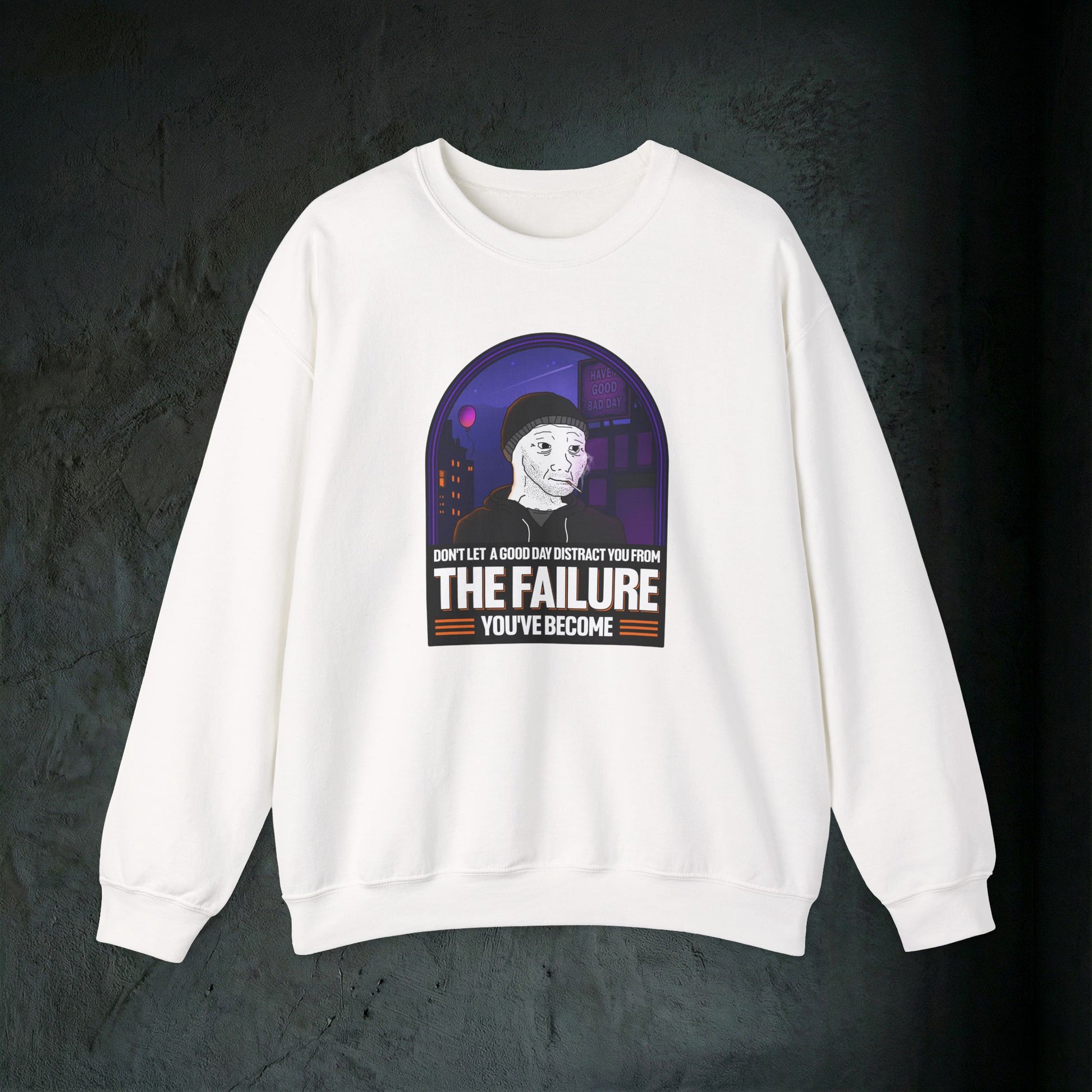 Just because you had one good day doesn't mean everything is fixed. This sweatshirt is the ultimate reality check. Featuring a smoking Wojak against a purple city skyline and the brutal caption "Don't let a good day distract you from the THE FAILURE YOU'VE BECOME", it serves as a humble reminder to stay grounded in your own misery. It’s dark, hilarious, and perfectly cynical.