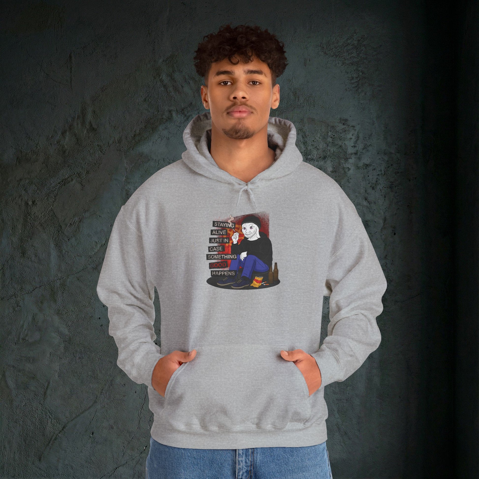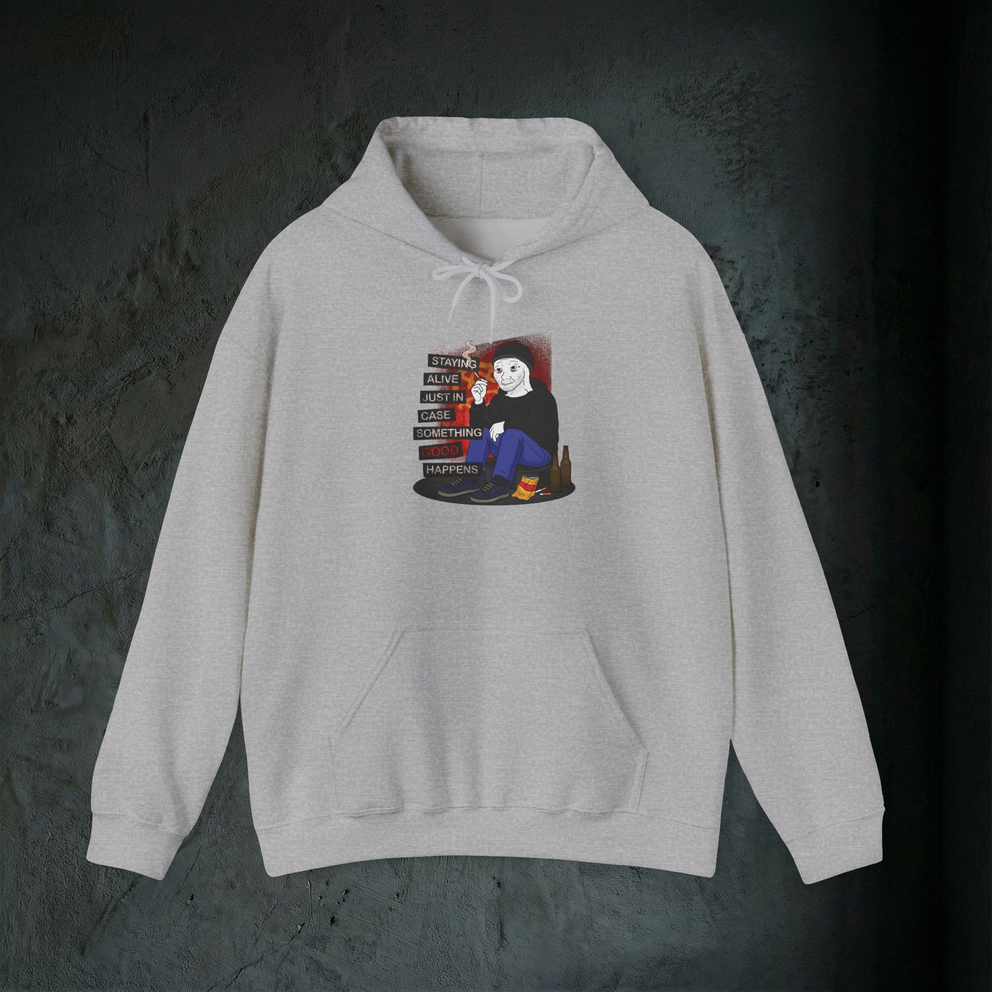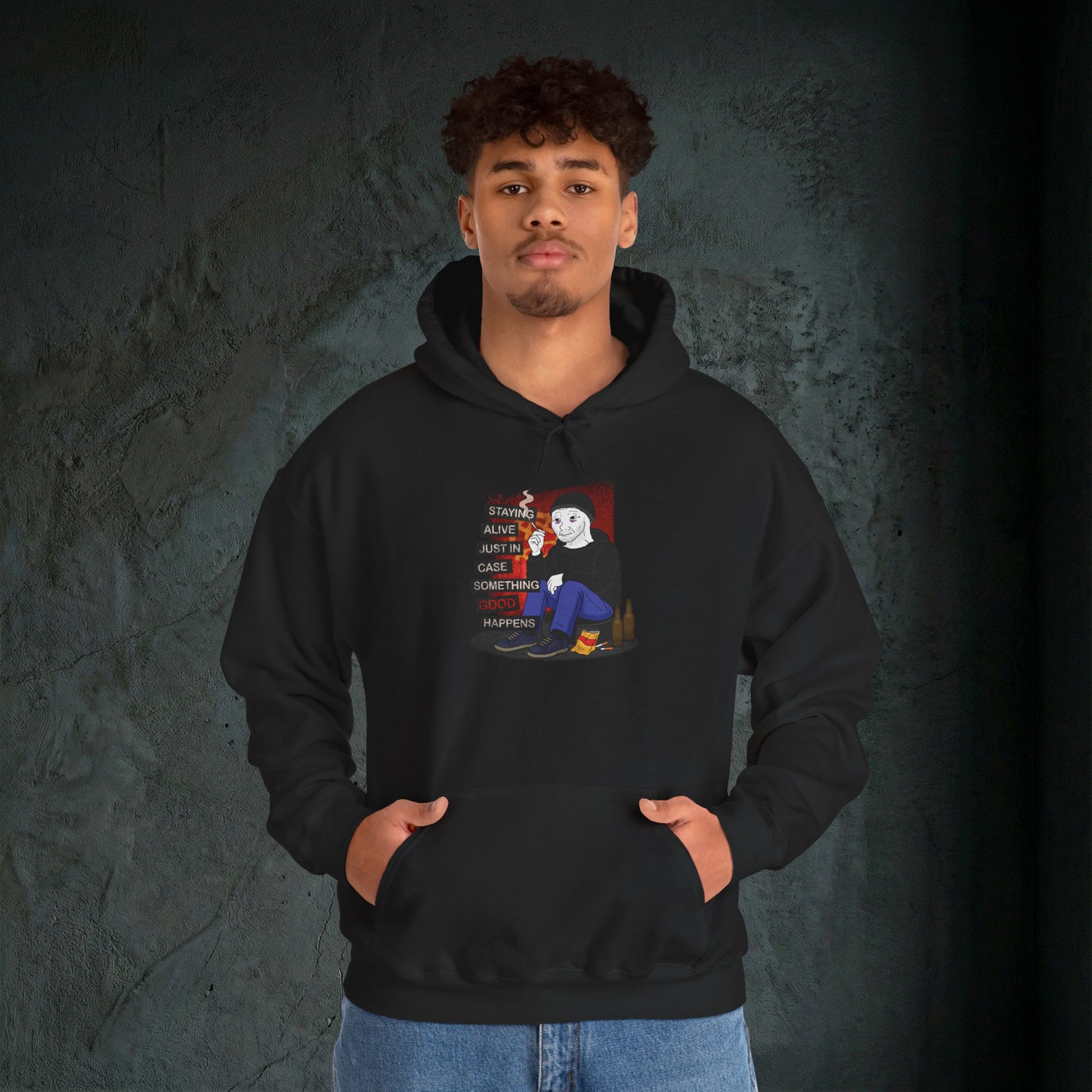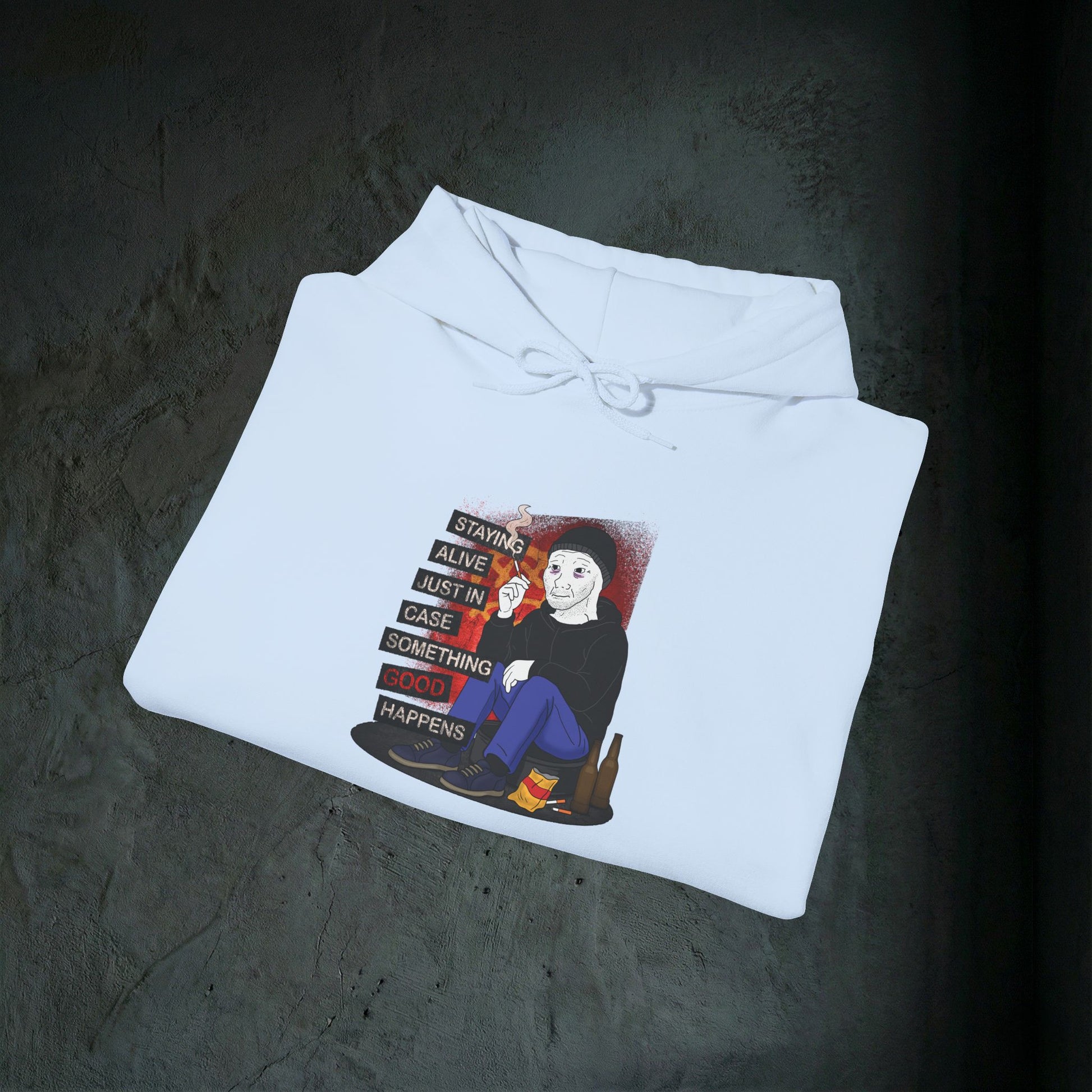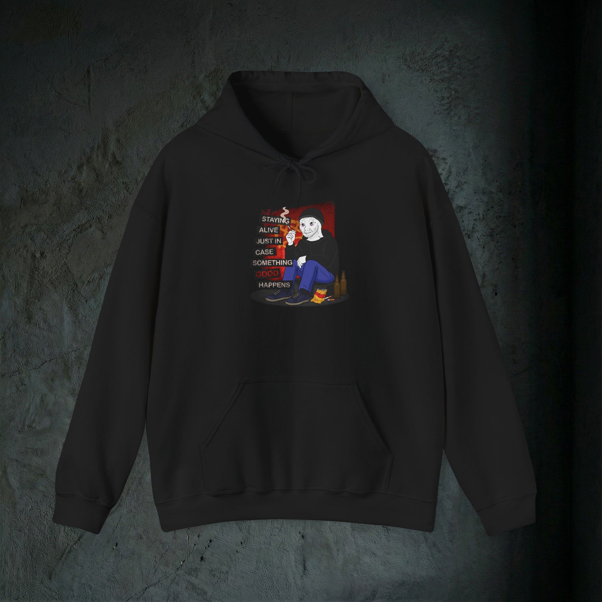 This isn't toxic positivity; it’s just stubborn curiosity. This hoodie features the viral text "Staying Alive Just In Case Something Good Happens," paired with a Doomer Wojak surviving on chips and cheap drinks. It captures the specific feeling of hanging on by a thread, not because you’re happy, but because you don't want to miss the plot twist if things actually get better.