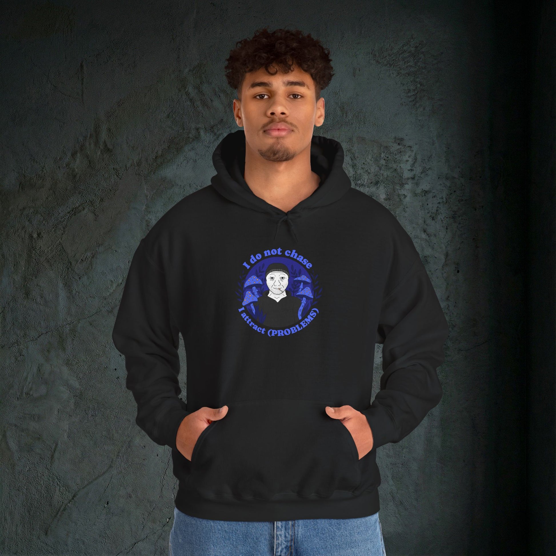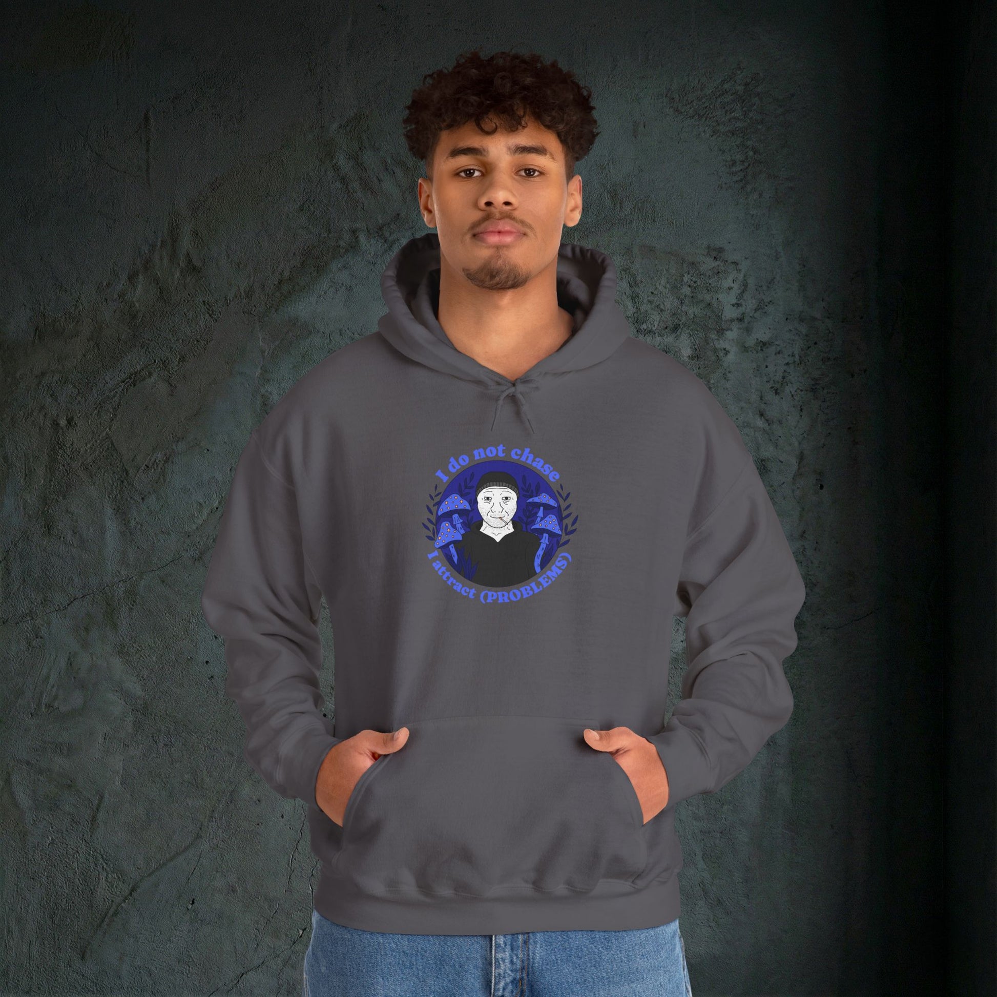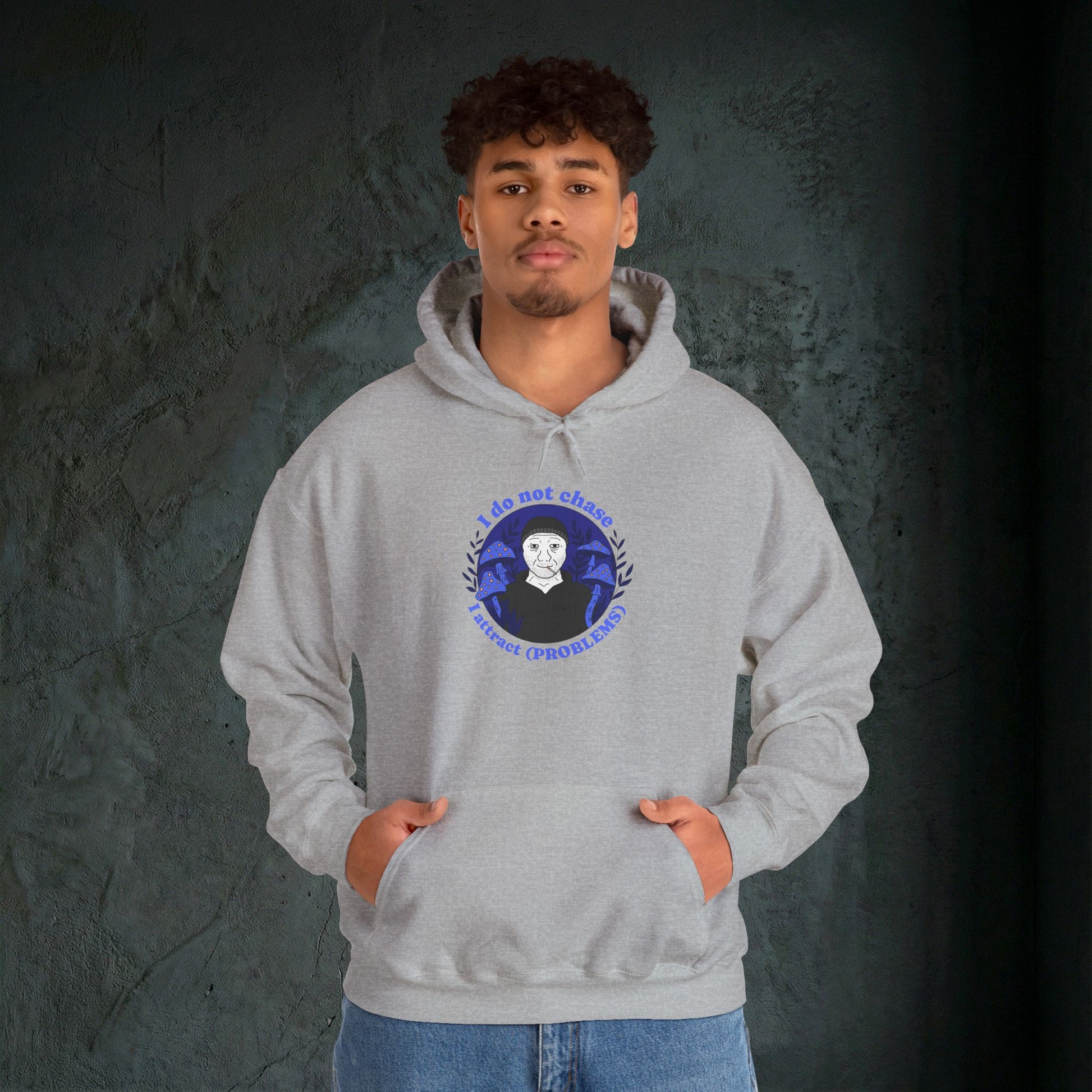 Some people use the law of attraction to manifest wealth and success. We just seem to manifest absolute disaster. This hoodie captures that energy perfectly. Featuring the viral "I do not chase, I attract (PROBLEMS)" slogan surrounding a smoking Wojak in a field of psychedelic blue mushrooms, it is the perfect ironic statement for anyone whose life feels like a magnet for bad luck.