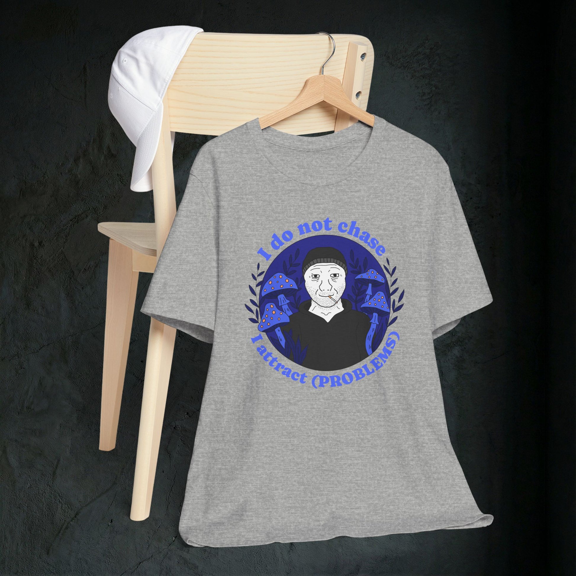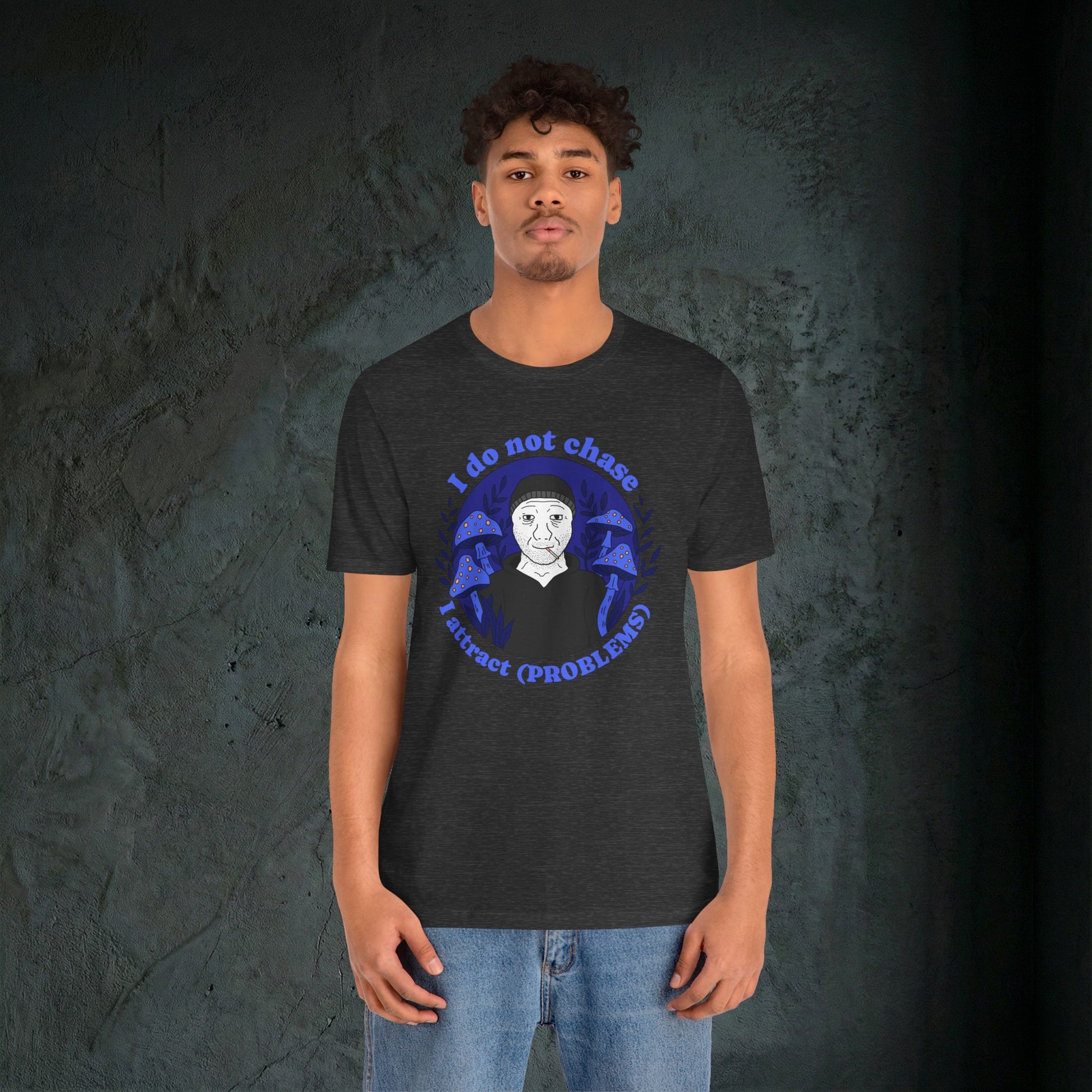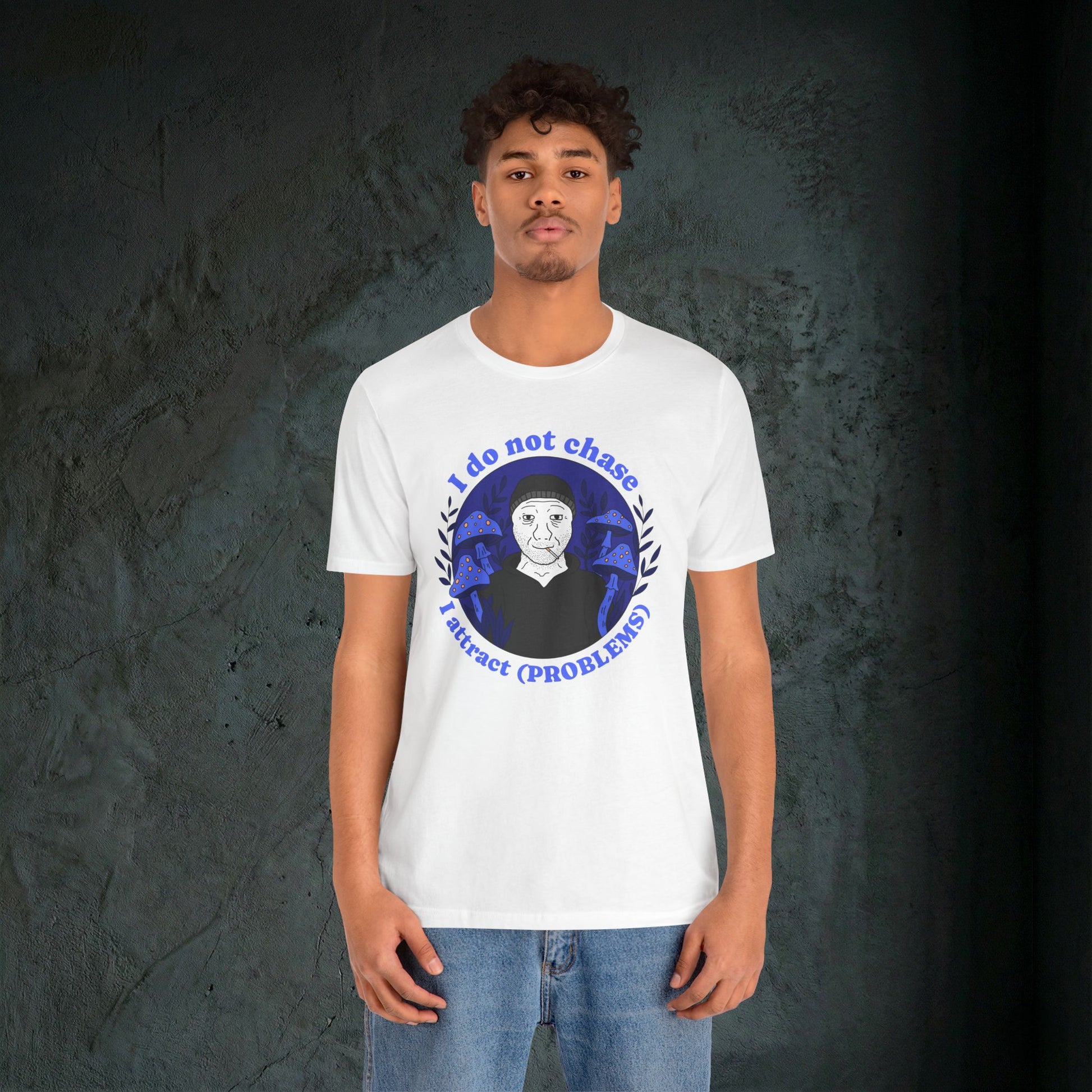 Some people use the law of attraction to manifest wealth and success. We just seem to manifest absolute disaster. This tee captures that energy perfectly. Featuring the viral "I do not chase, I attract (PROBLEMS)" slogan surrounding a smoking Wojak in a field of psychedelic blue mushrooms, it is the perfect ironic statement for anyone whose life feels like a magnet for bad luck.