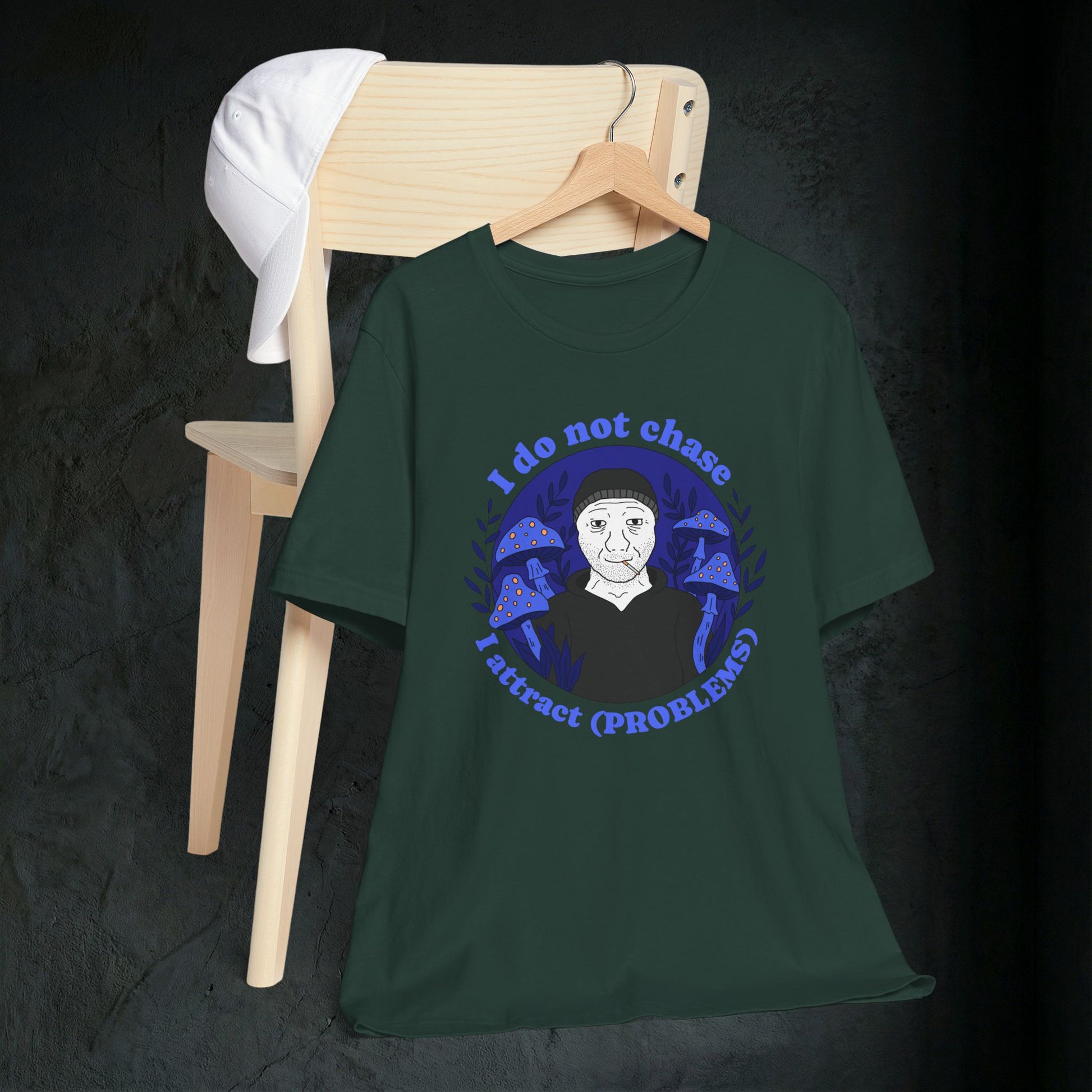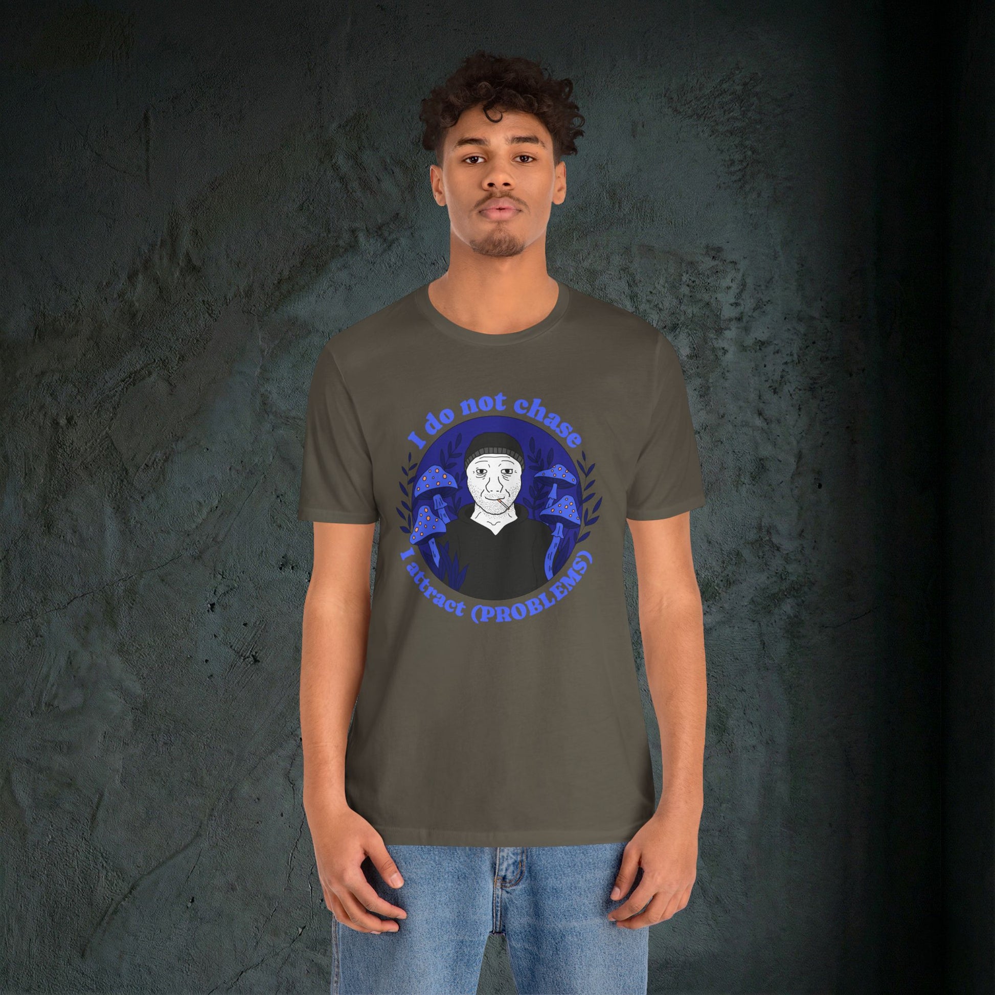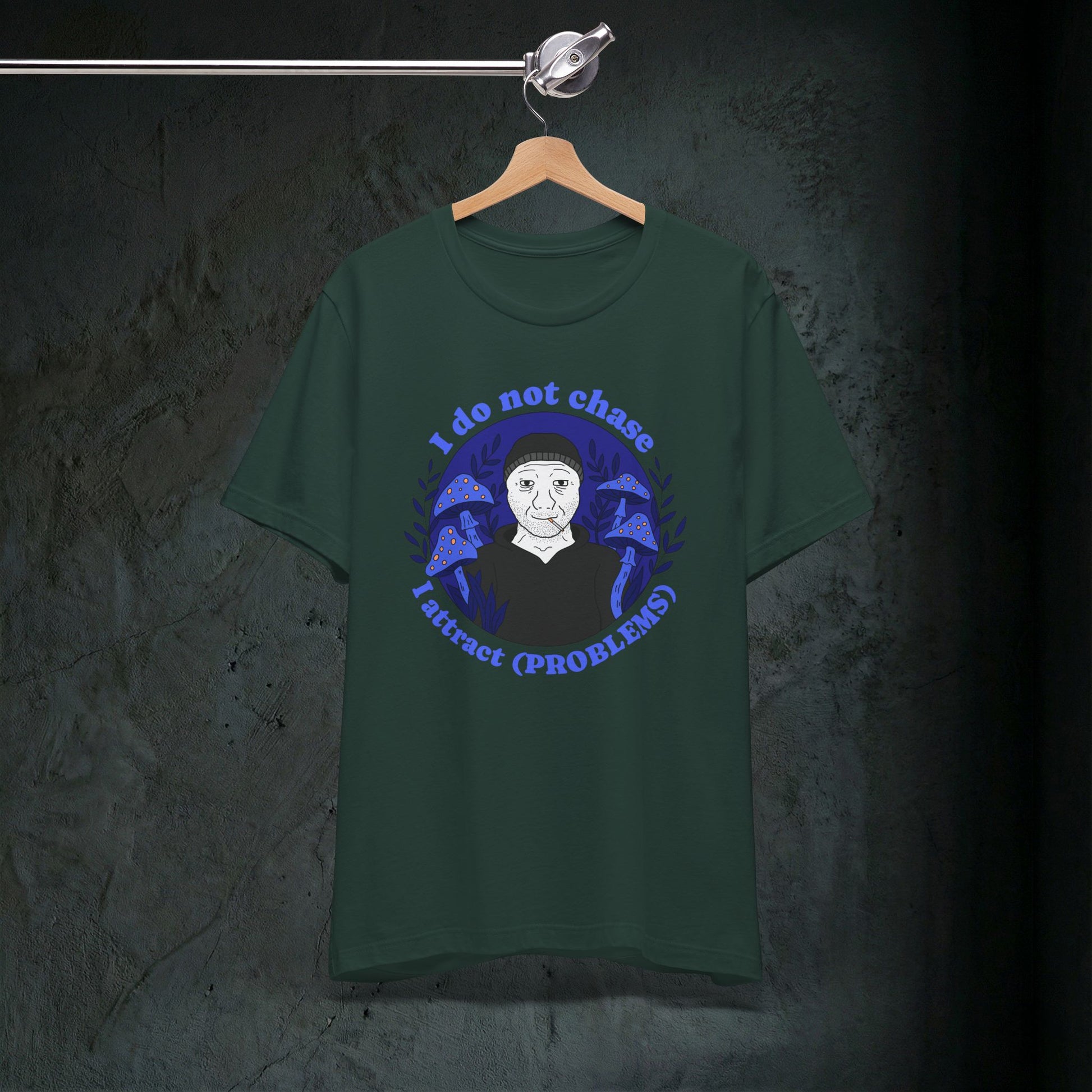 Some people use the law of attraction to manifest wealth and success. We just seem to manifest absolute disaster. This tee captures that energy perfectly. Featuring the viral "I do not chase, I attract (PROBLEMS)" slogan surrounding a smoking Wojak in a field of psychedelic blue mushrooms, it is the perfect ironic statement for anyone whose life feels like a magnet for bad luck.