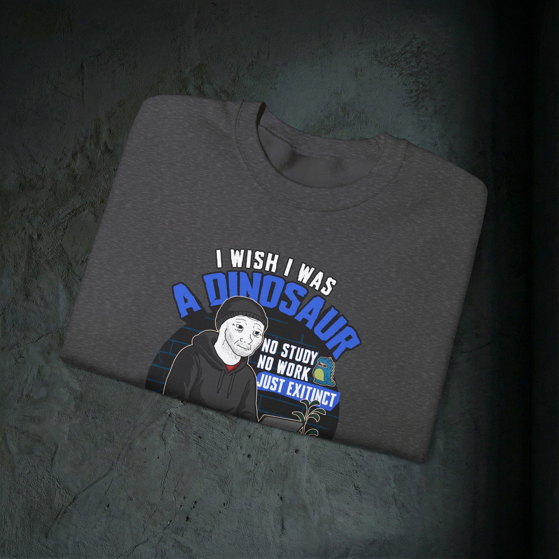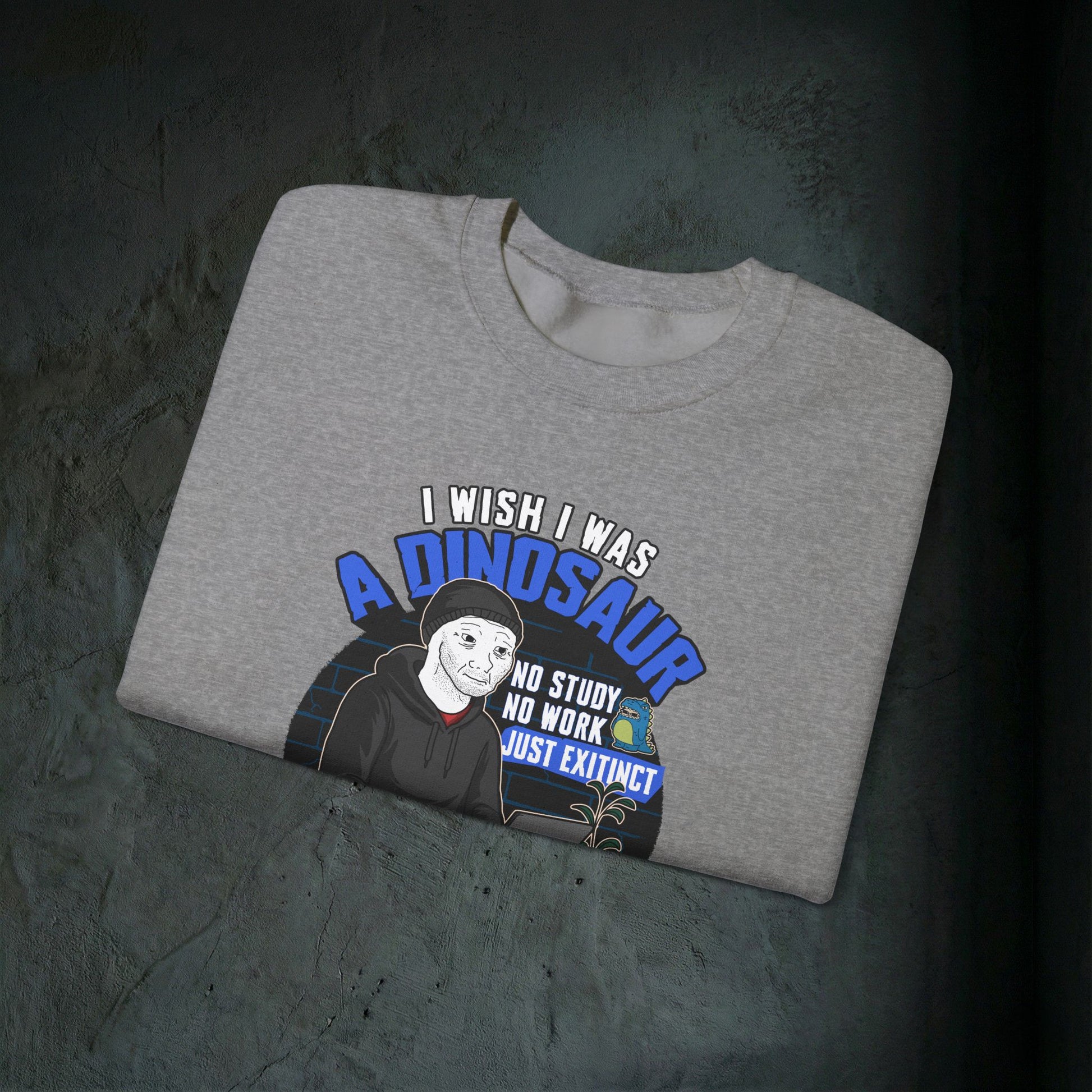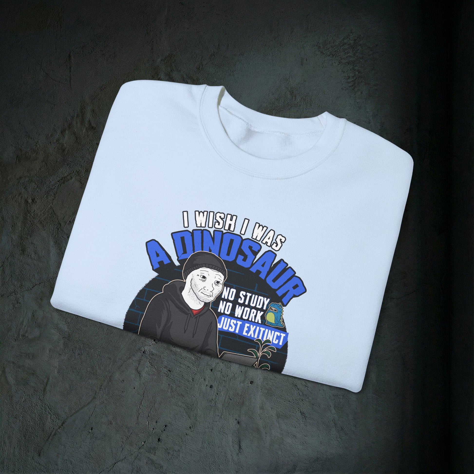Modern life is exhausting. You have to study, work, pay bills, and reply to emails. Dinosaurs didn't have to do any of that; they just got to be extinct. This sweatshirt captures that specific craving for peace. Featuring a burnt-out Wojak sitting at a cafe with his laptop and the caption "I WISH I WAS A DINOSAUR... NO STUDY. NO WORK. JUST EXTINCT", it is the perfect uniform for anyone who is totally over the hustle culture.