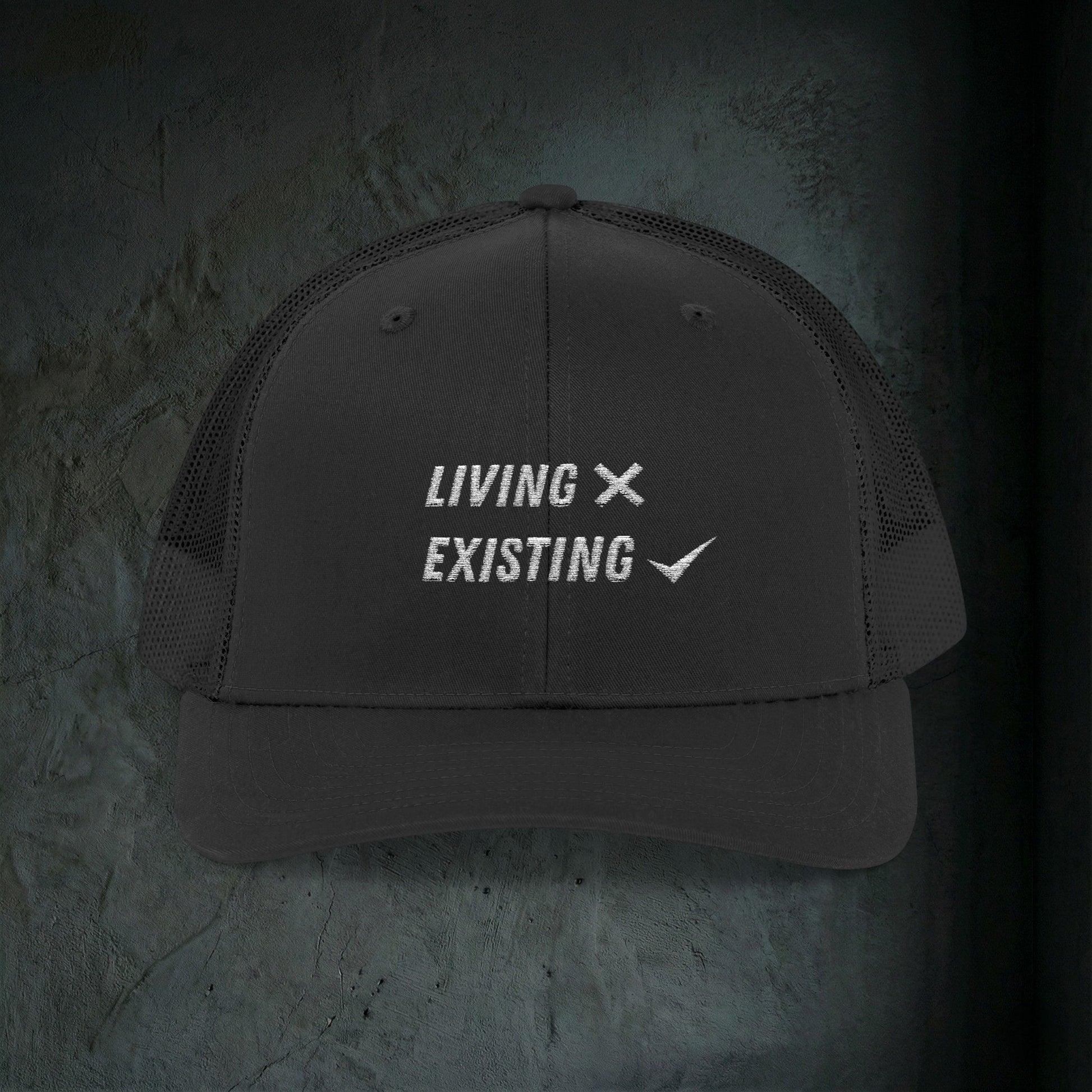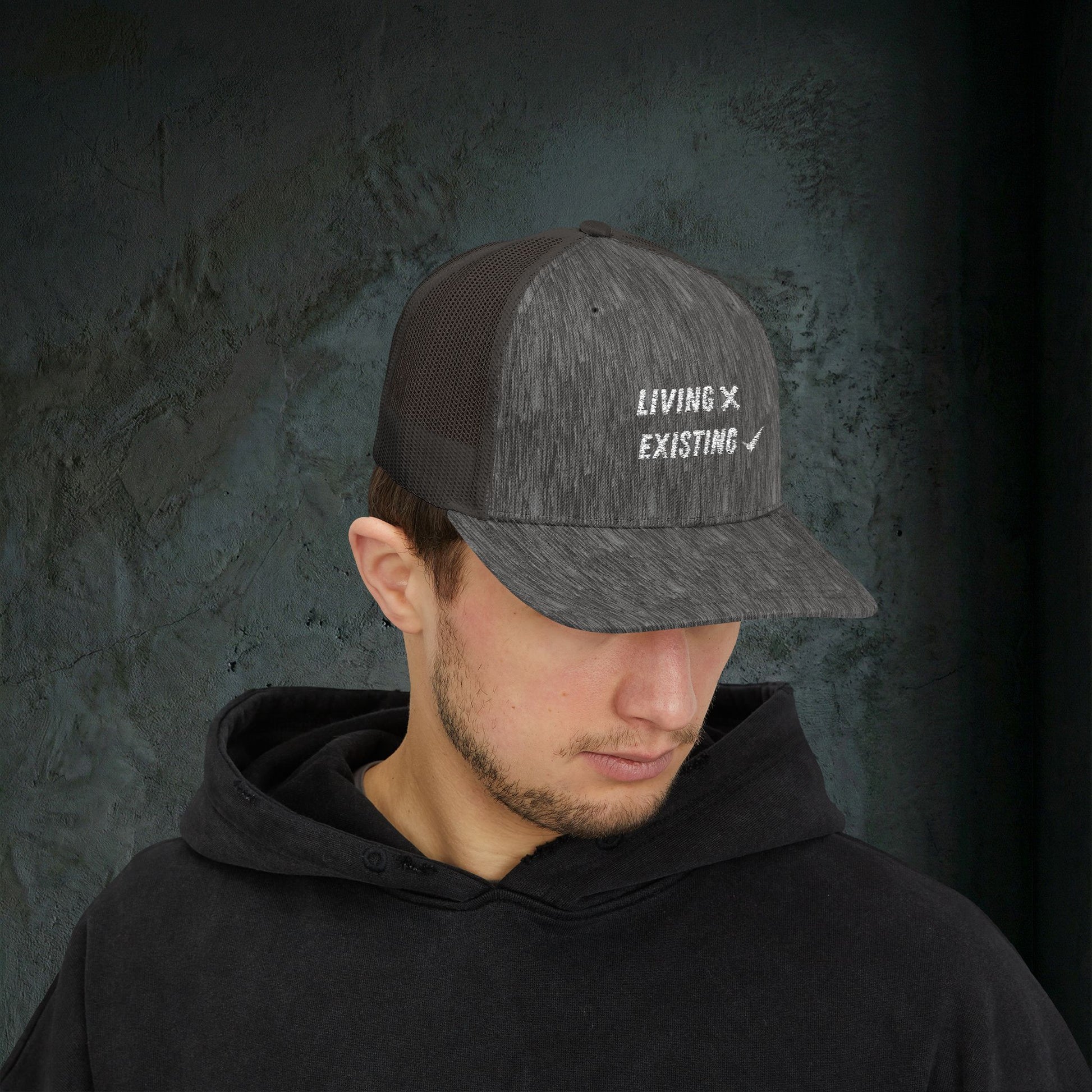 Let’s be real - most days we aren't exactly "living our best life." We are just existing. This trucker cap captures that specific feeling when you're running on caffeine and dissociation. It features the brutally honest "Living [X] Existing [✓]" embroidery on the front, saving you the trouble of explaining your mood to anyone who asks. It’s quiet, direct, and fits perfectly into the modern doomer wardrobe.
