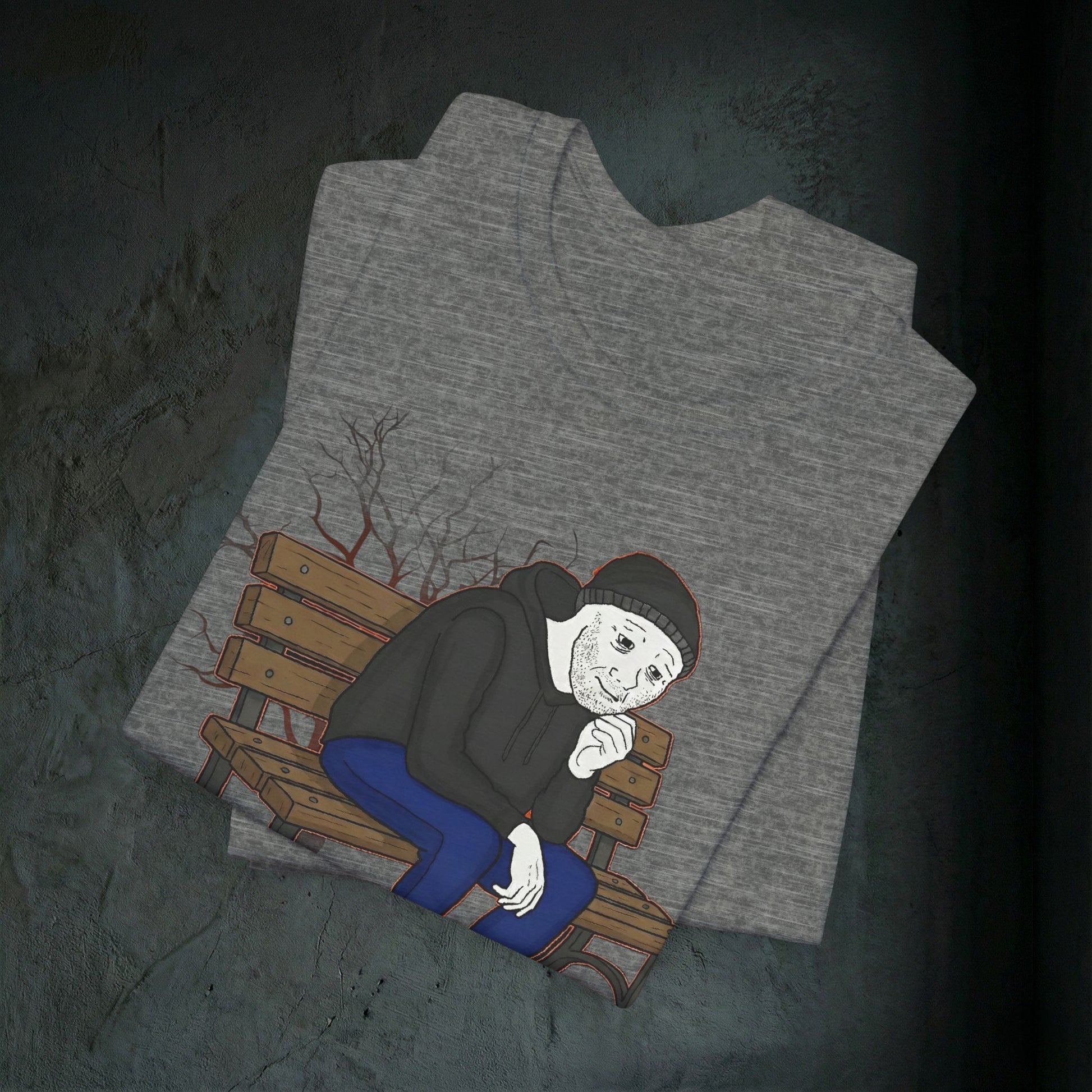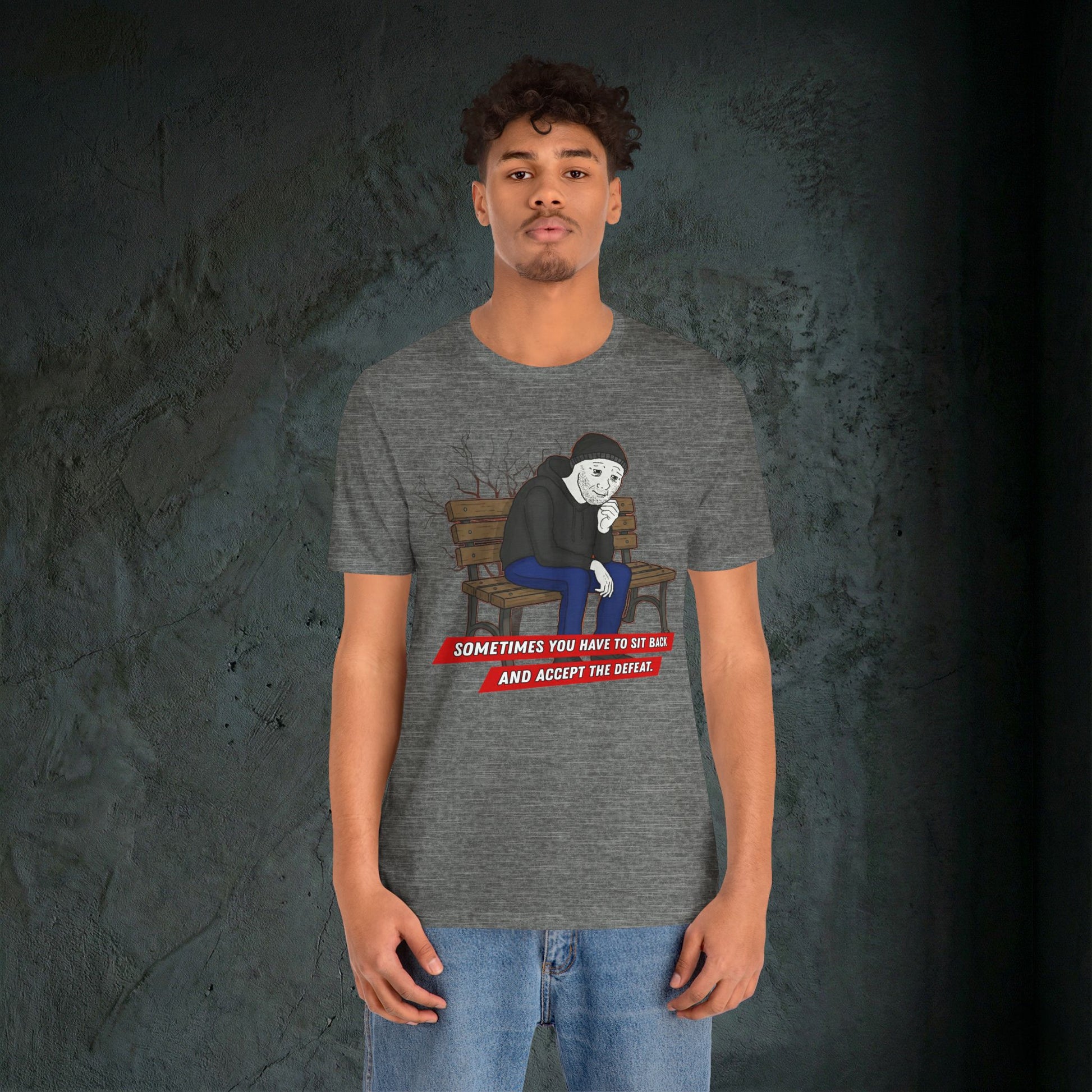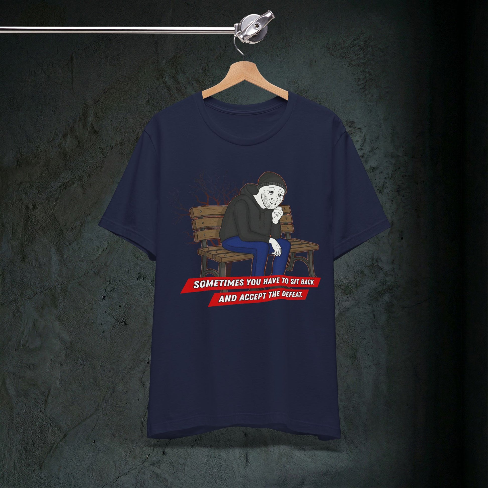 Stop fighting. It’s over. This tee is dedicated to that specific moment of clarity when you realize trying is pointless and it’s time to just give up. Featuring the iconic Wojak sitting alone on a park bench with the banner text "Sometimes You Have To Sit Back And Accept The Defeat", it is the ultimate statement piece for the burnt-out generation. It’s not negative; it’s just realistic.